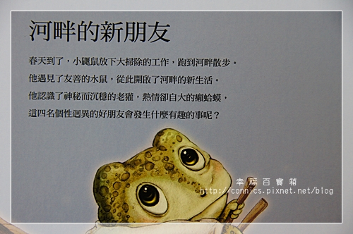 春天到了,小鼴鼠放下大掃除的工作,跑到河畔散步。他遇見了友善的水鼠,從此開啟了河畔的新生活。他認識了神秘而沉穩的老獾,熱情卻自大的癩蛤蟆,這四名個性迥異的好朋友會發生什麼有趣的事呢 ?