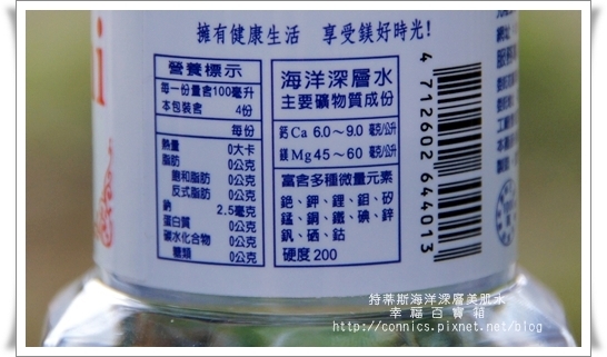 營養標示: 每一份量100毫升(包裝含4份) 熱量/Calorie 0大卡 蛋白質/Protein 0公克 脂肪/Fat 0公克 飽和脂肪酸/Saturated Fatty Acid 0公克 反式脂肪酸/Trans Fatty Acid 0公克 碳水化合物/Carbohydrate 0公克 鈉/sodium 2.5毫克 成分: 百分之百海洋深層水(硬度200) 主成分:鈣Ca 6.0~9.0毫克/公升、鎂Mg 45-60毫克/公升 一般營養素的簡介: 『鈣』我們的身體含有多種礦物質,其中以鈣的含量最多。99%的鈣質儲藏於骨骼和牙齒,其餘的則存於血液中有助血液凝固、協助心臟和肌肉收縮等功用,當血液中的鈣質不足,骨骼內的鈣質便被提取到血液中,而造成骨質疏鬆。而長期缺乏鈣質也會造成精神緊張,而國人普遍對於鈣質吸收不足,其原因為食物中的鈣離子不易被吸收。
